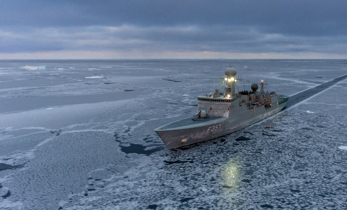 Inspektionsskibet Thetis patruljer i is i Diskobugten på den grønlandske vestkyst. Foto: Brian Djurslev / Forsvaret